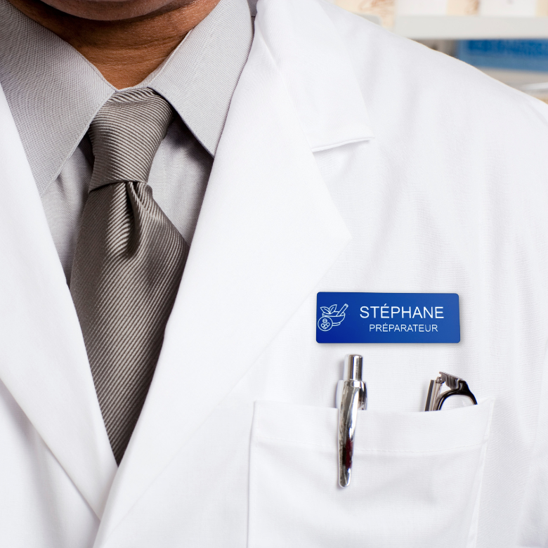 Optez pour un badge professionnel personnalisé adapté aux métiers de la santé. Que vous soyez pharmacien, préparateur en pharmacie, opticien, infirmier, dentiste, vétérinaire ou médecin, affichez votre identité avec élégance et clarté. Ce badge apporte une touche professionnelle tout en garantissant une lecture fluide et une tenue durable.