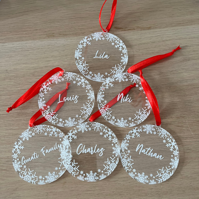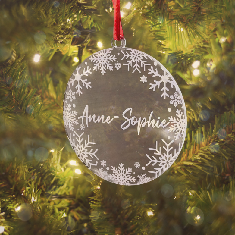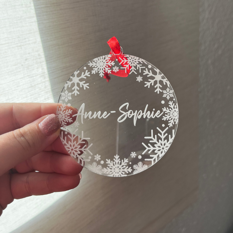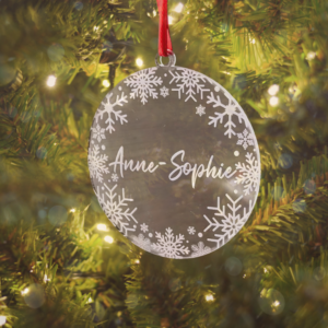 Apportez une touche élégante à vos décorations de fêtes avec notre boule de Noël en acrylique transparent de 3 mm d’épaisseur. Décorée avec des flocons de neige gravés, cette boule personnalisable permet d’ajouter le prénom de votre choix, créant ainsi une décoration unique et festive pour votre sapin. D’un diamètre de 8 cm, elle s’intègre harmonieusement dans toutes les ambiances de Noël. Le joli ruban rouge inclus facilite la suspension et ajoute une note traditionnelle à votre décoration.