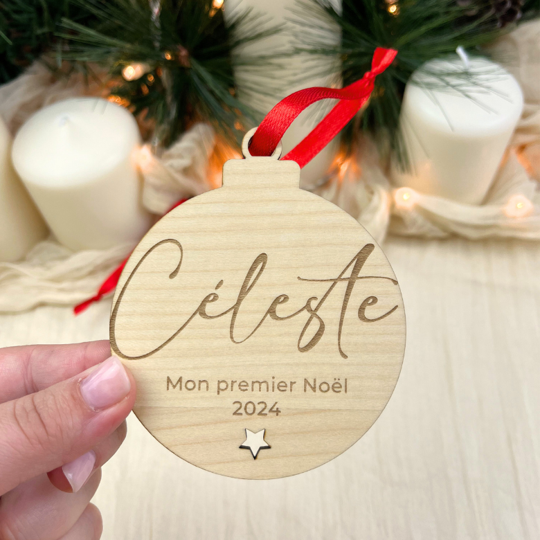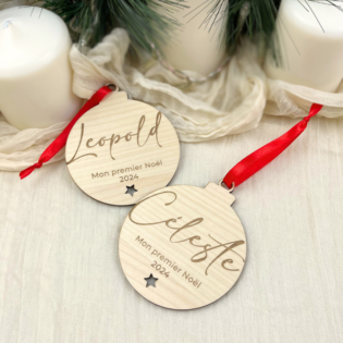 La boule, d’un diamètre de 8 cm, est parfaite pour célébrer le premier Noël de votre enfant et pour embellir votre sapin avec un souvenir personnalisé. Fabriquée en bois de haute qualité, cette boule est un choix à la fois esthétique et durable, à conserver pendant des années.