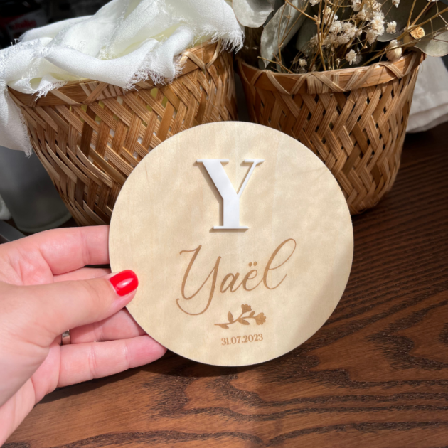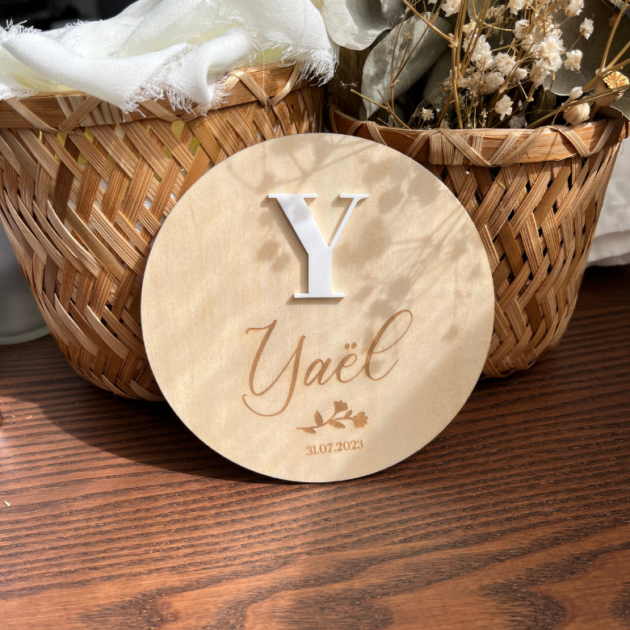 Découvrez notre carte de naissance en bois d’érable clair, agrémentée de fleurs tendres. Chaque carte est personnalisée avec soin : l’initiale du prénom est réalisée en plexi coloré ou en effet miroir or, argent ou or rose. Nous gravons élégamment le prénom avec une écriture manuscrite sur le bois, accompagné d’une branche de fleurs tendres ainsi que de la date de naissance ou de l’année. Cette carte devient un précieux souvenir, symbolisant un amour sincère pour célébrer l’arrivée d’un nouveau-né. Offrez un cadeau unique avec notre carte en bois et fleurs tendres, parfait pour les nouveaux parents. Que ce soit pour un baptême, une naissance ou toute autre occasion spéciale, elle devient un trésor mémorable. Personnalisée avec soin, elle apporte une touche artistique à chaque moment précieux de la vie de votre enfant.