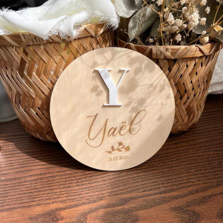 Carte de naissance en bois d’érable avec fleurs tendres et initiale en plexi miroir, 12 centimètre de diamètre, parfaite pour les nouveaux parents.