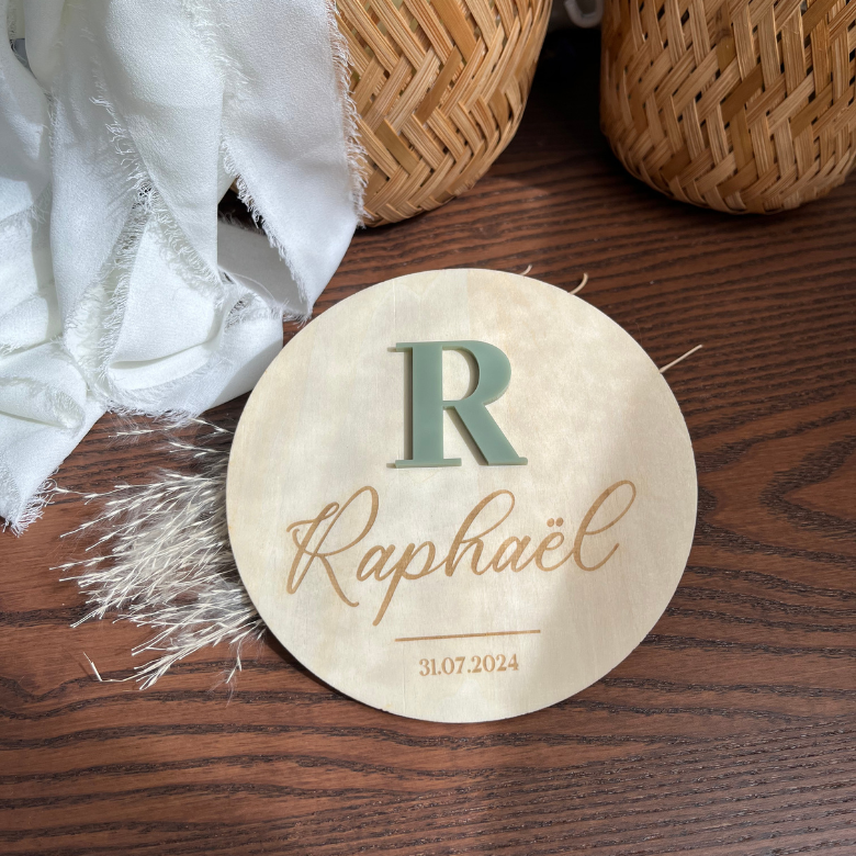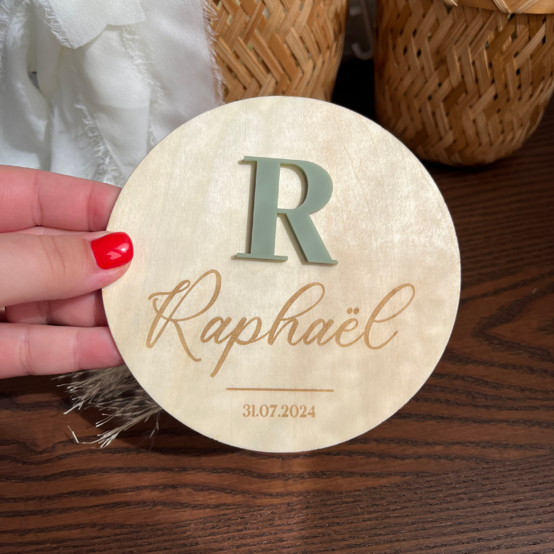 Cette élégante carte de naissance combine minimalisme et personnalisation raffinée. Chaque carte, mesurant 12 cm de diamètre en bois, met en avant une écriture manuscrite soulignée pour mettre le prénom de l’enfant en valeur, avec la date ou l’année de naissance élégamment inscrite en dessous. Au-dessus du texte, l’initiale du prénom est mise en avant en acrylique coloré, ou miroir en relief, ajoutant une dimension visuelle et tactile unique. Parfaite pour un cadeau de naissance, une décoration de chambre d’enfant ou comme souvenir mémorable de ce moment spécial