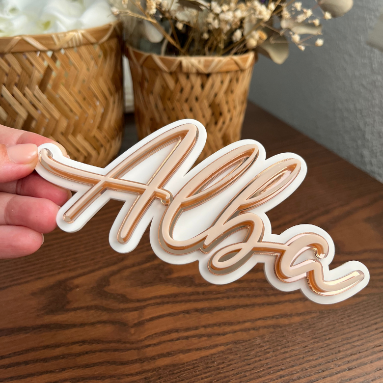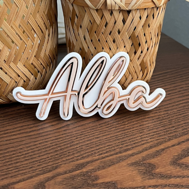 Décoration murale prénom acrylique triple épaisseur, modèle Alba & David. Personnalisation disponible en plusieurs couleurs et finitions. Idéal pour la décoration murale ou de porte. Disponible en trois largeurs  15, 30 ou 58 cm. La hauteur varie en fonction des lettres et le nombre de caractères.