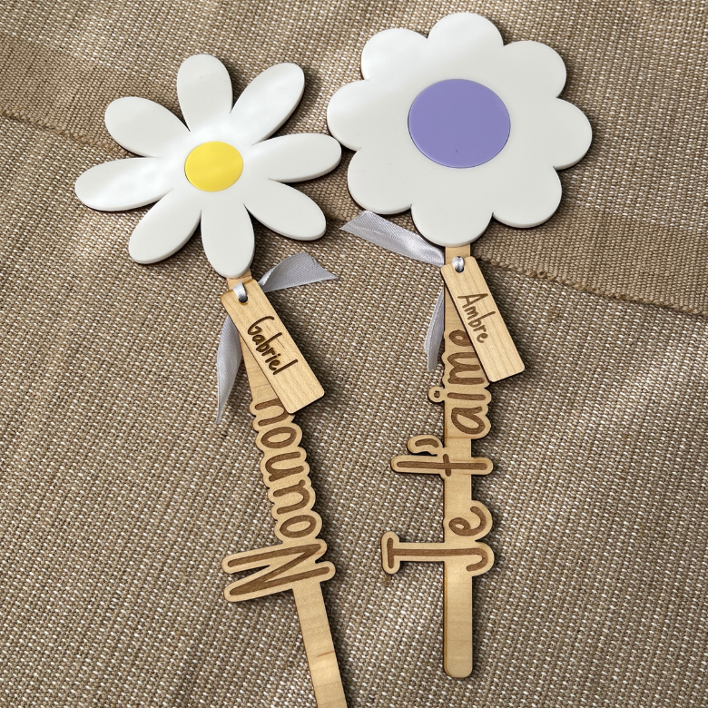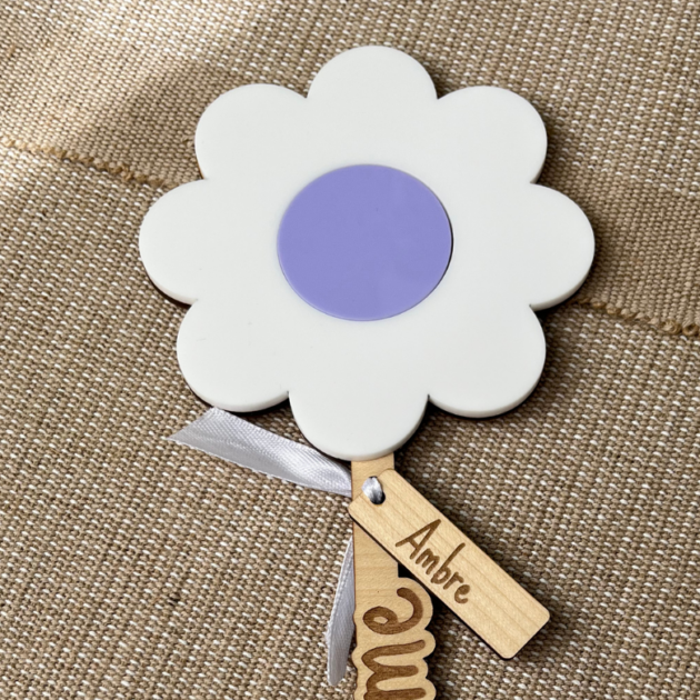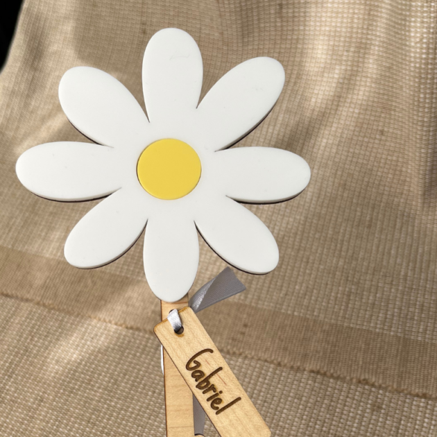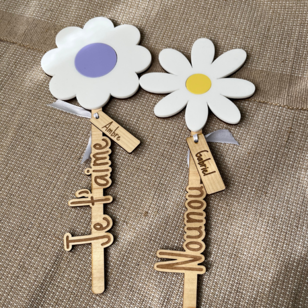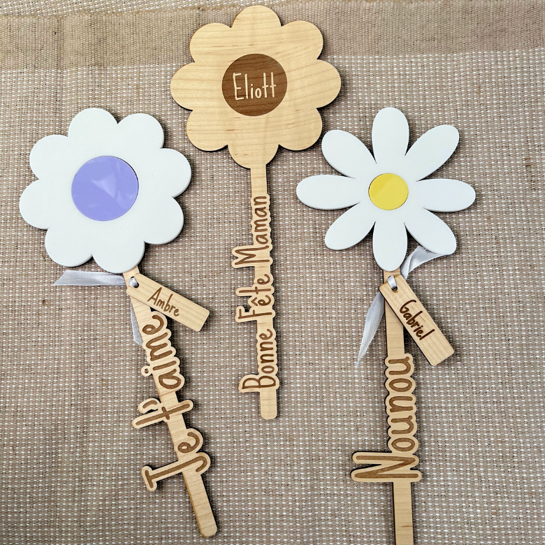 Sur la tige en bois, vous pouvez faire graver un petit message personnalisé : quelques mots, une déclaration, ou tout simplement “Bonne fête Maman”. Au sommet de la fleur, une étiquette en bois permet aussi d’inscrire le prénom de la personne qui offre. Cette double personnalisation transforme chaque fleur en un souvenir unique.
