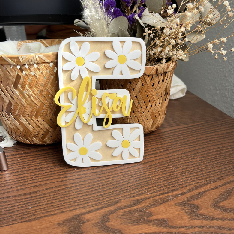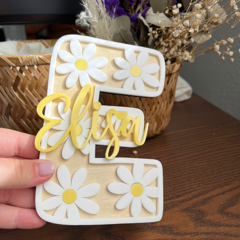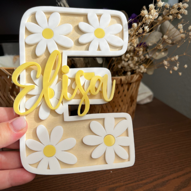 Tout d’abord, les lettres en acrylique blanc mat se superposent sur le fond en bois, créant un effet 3D saisissant. De plus, chaque lettre est décorée d’une fleur de marguerite avec un cœur en acrylique brillant. Vous pouvez personnaliser la couleur du cœur de la fleur selon vos préférences : miroir or, or rose ou argent.