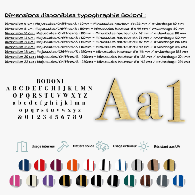 Ensuite, nos lettres et chiffres adhésifs Bodoni se déclinent en 21 coloris. La couleur principale orne le dessus, tandis qu’une couleur différente met en valeur la tranche. Cela apporte une touche unique à votre décoration. De plus, chaque pièce, découpée au laser, garantit une finition parfaite et nette. Vous obtenez ainsi un rendu professionnel et esthétique.