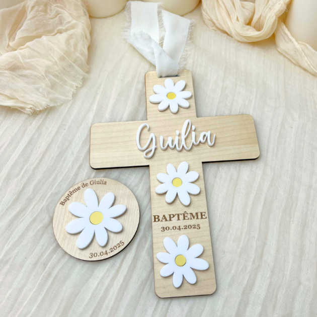 Dans la même collection, il est possible d’assortir ce magnet avec d’autres éléments décoratifs pour harmoniser votre événement. Le cake topper marguerite est idéal pour décorer un gâteau avec élégance, tandis que la croix de baptême marguerite complète une ambiance spirituelle et symbolique. Ces accessoires permettent de créer une décoration cohérente et pleine de douceur.