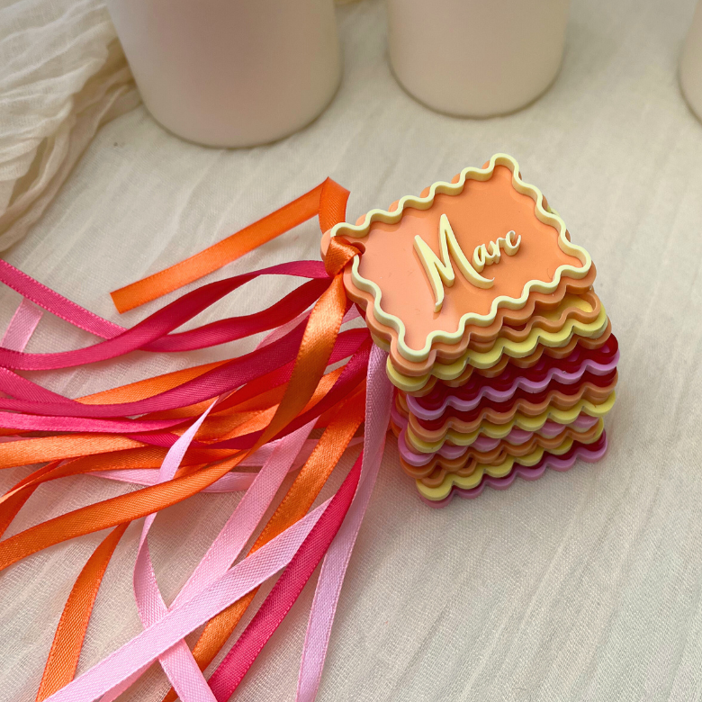 Chaque marque-place est accompagné d’un ruban de satin choisi avec soin pour s’harmoniser parfaitement avec la couleur sélectionnée. Les couleurs des rubans incluent rose, orange et fuchsia, ajoutant une touche supplémentaire de raffinement à votre décoration. Ces marque-places peuvent également être accrochés à un verre à pied, offrant ainsi une manière élégante et pratique d’identifier les verres de vos invités.