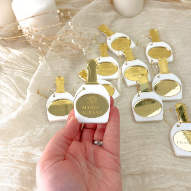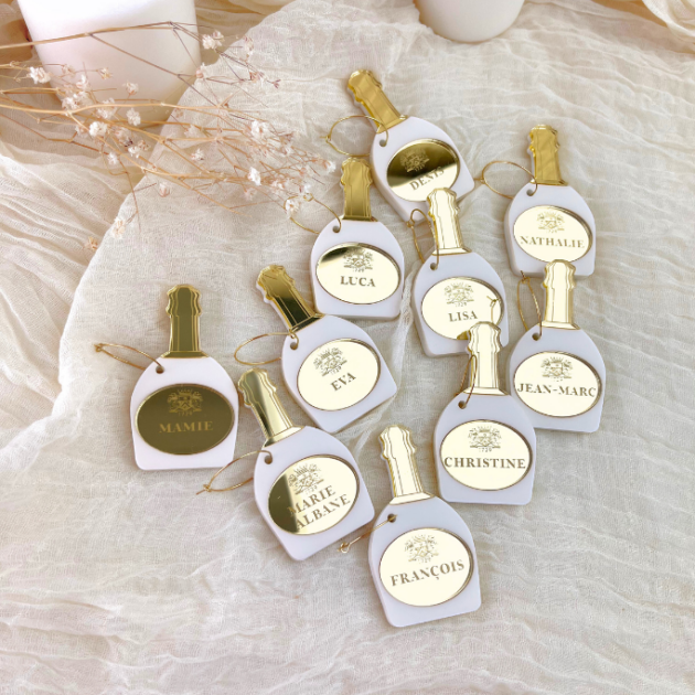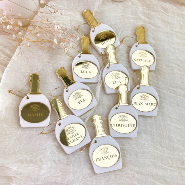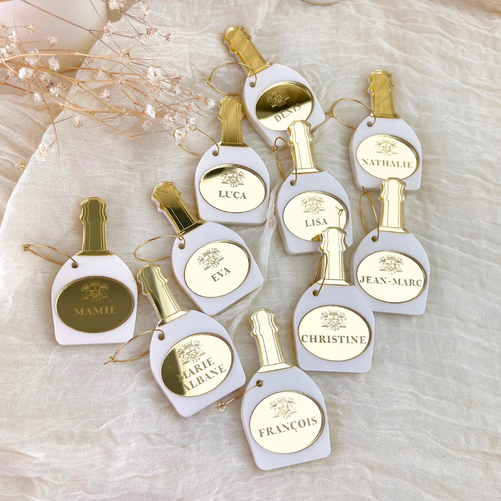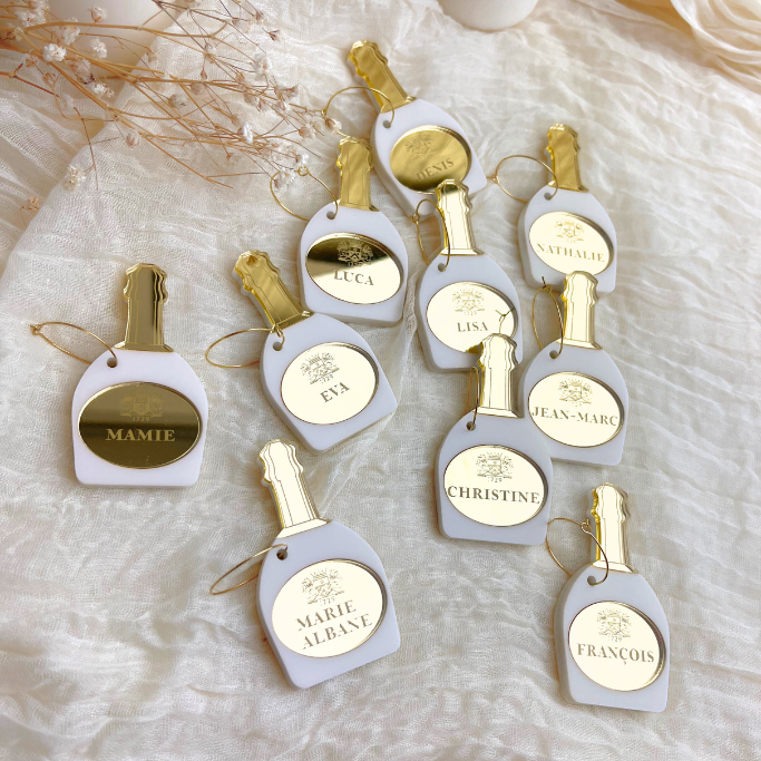 Apportez une note raffinée à votre événement avec ce marque-verre en forme de bouteille de champagne. Conçu pour s’accrocher facilement à un verre à pied ou une coupe de champagne, il ajoute une touche élégante et personnalisée à votre décoration de table. Parfait pour un mariage, un anniversaire ou toute célébration, il permet à chaque invité de retrouver son verre en un clin d’œil.
