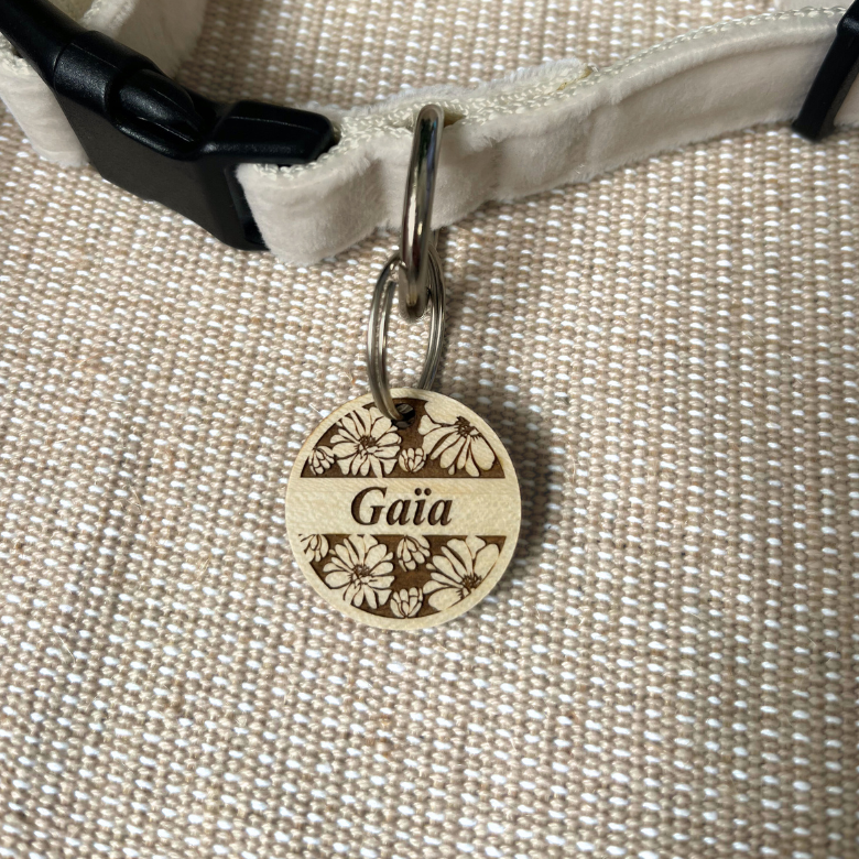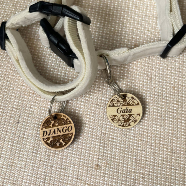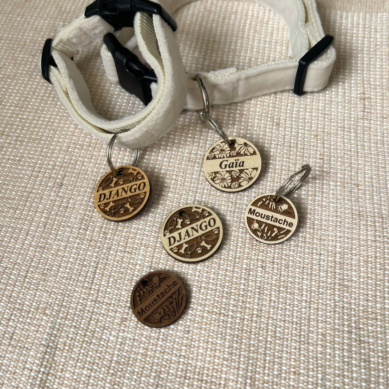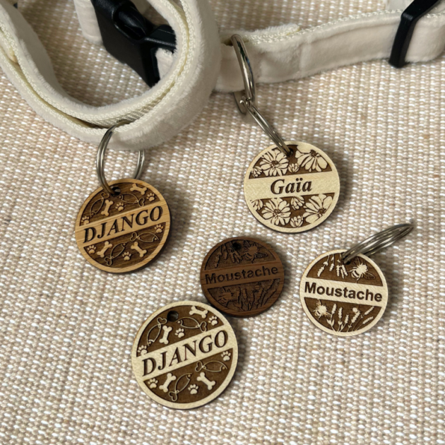 Chaque médaille est gravée avec précision. Vous pouvez y faire inscrire le prénom de votre compagnon, un numéro de téléphone ou un message court. Le texte est lisible, net et gravé directement dans le bois, sans peinture.