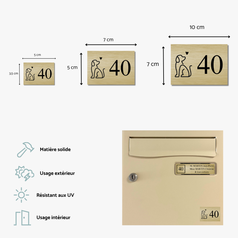 Personnalisez votre boîte aux lettres avec nos numéros avec motif de chien coeur en PVC de la marque Jymm. Conçus pour une identification claire et esthétique, nos numéros sont disponibles en trois formats différents : 5×3,5 cm, 7×5 cm, ou 10×7 cm, et en plusieurs coloris. Faciles à installer grâce à l’adhésif 3M pré-appliqué, ces numéros offrent une solution pratique et durable pour toutes les boîtes aux lettres.