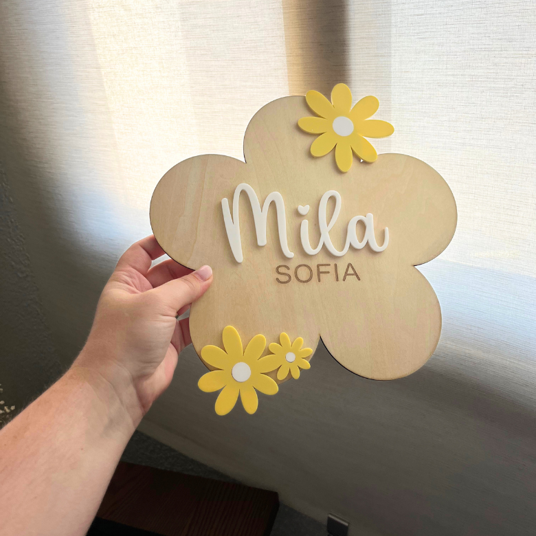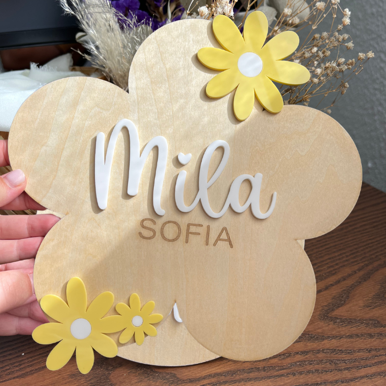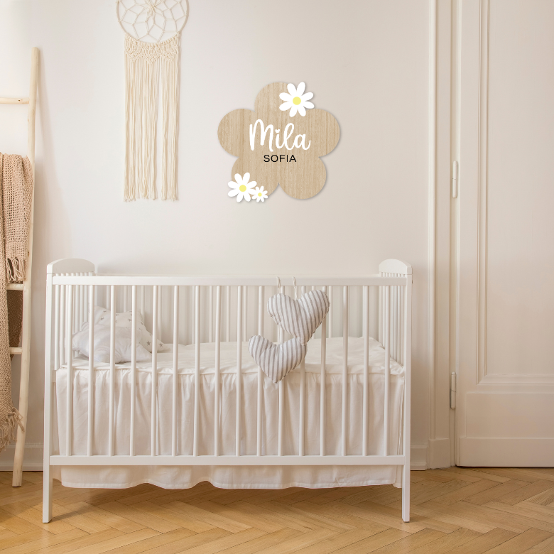 Trois marguerites en 3D subliment l’ensemble, apportant une touche artistique et vivante. Vous pouvez choisir la couleur du prénom et des fleurs pour une personnalisation complète. Les fleurs sont disponibles en deux combinaisons : jaune cœur blanc ou blanc cœur jaune, pour se rapprocher au mieux des vraies marguerites.