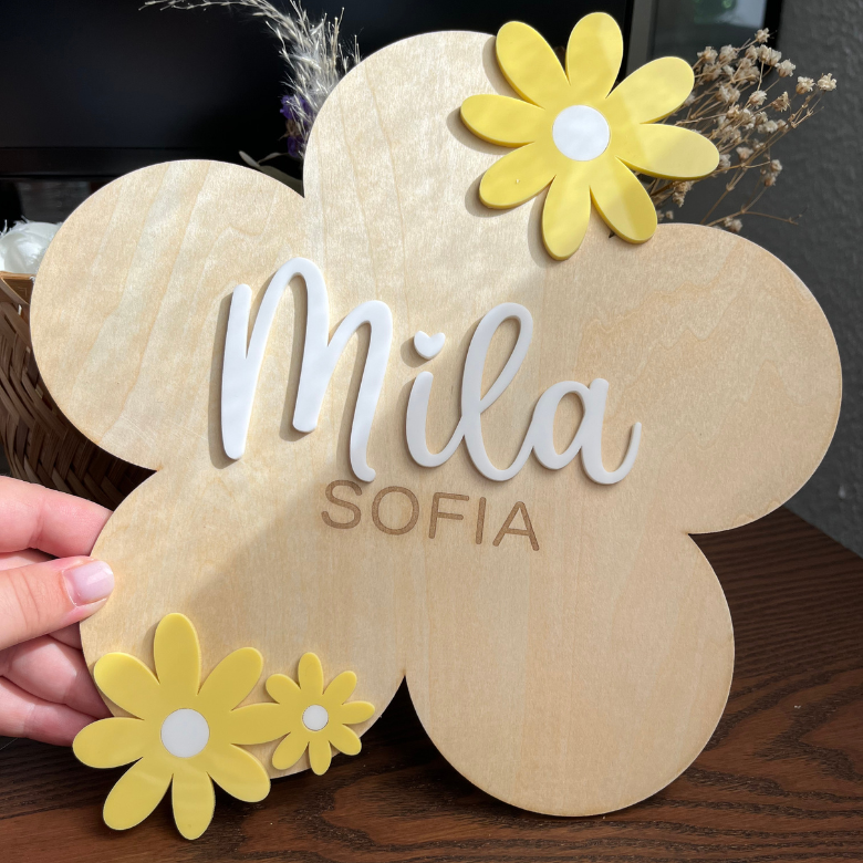 Le prénom et le nom peuvent comporter jusqu’à 12 caractères. La taille et la dimension du texte s’adaptent en fonction de la dimension choisie. Le prénom en acrylique est disponible en plusieurs couleurs et également en versions miroir or, or rose ou argent. Cette pancarte prénom et nom marguerite apporte une touche de charme naturel et une personnalisation unique à toute chambre d’enfant.