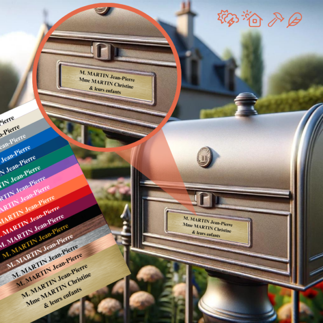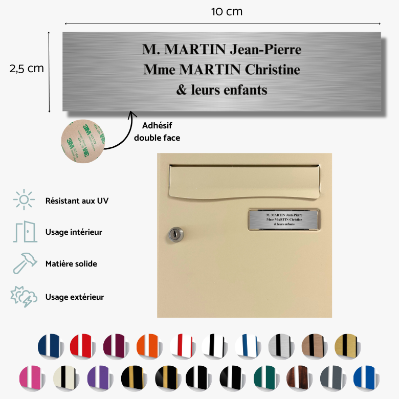 Vous pouvez personnaliser votre plaque boîte aux lettres PVC sur 1, 2 ou 3 lignes. Plusieurs coloris sont disponibles, y compris des teintes dorées, argentées et des couleurs vives. Vous choisissez le style qui convient le mieux à votre boîte aux lettres ou aux règles de votre copropriété.