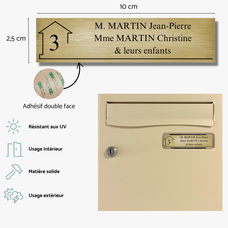 - Dimensions idéales : la plaque mesure 10 x 2,5 cm, une taille parfaite pour une visibilité optimale sans encombrer votre boîte aux lettres.