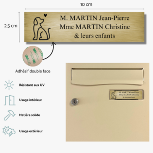 Ajoutez une touche personnelle à votre boîte aux lettres avec notre plaque boîte aux lettres adhésive PVC avec motifs de chien avec un coeur. Cette plaque mesure 10×2,5 cm et rend votre boîte aux lettres unique et élégante. Affichez votre amour pour les chiens avec une plaque boîte aux lettres motif de chien au design unique. Vous avez à disposition plusieurs dessins de races de chien et dessins de chien pour sublimer votre boîte aux lettres.