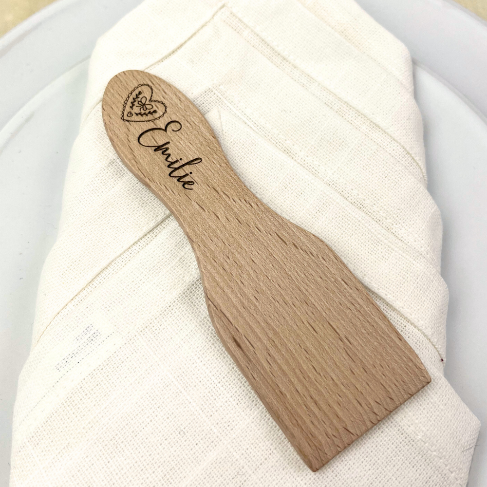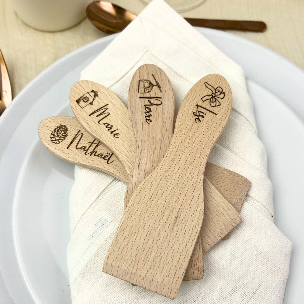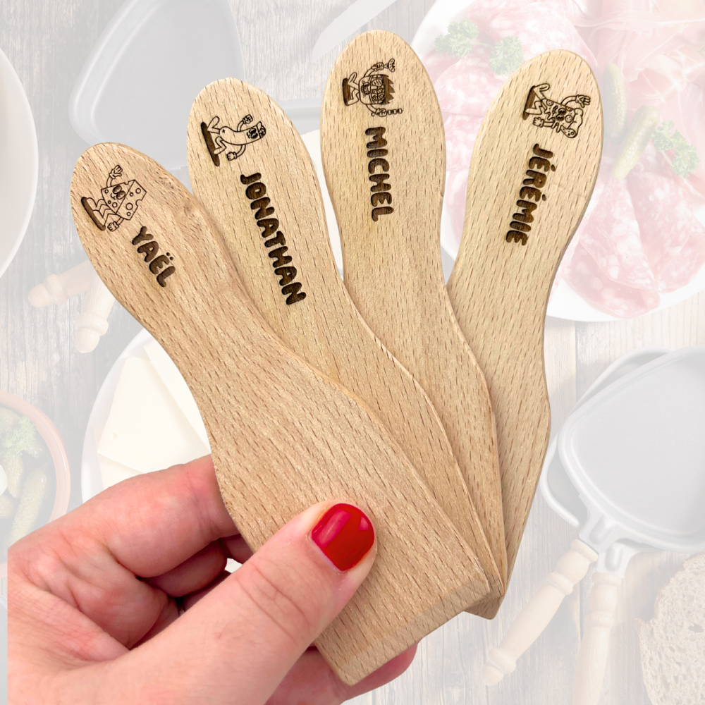 Chaque spatule peut être gravée individuellement : choisissez un motif, un prénom ou un texte pour différencier les spatules de chaque convive et apporter une touche conviviale et unique à vos soirées raclette.