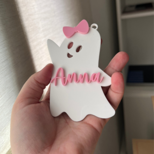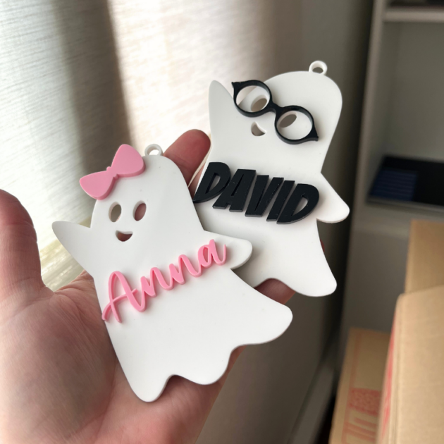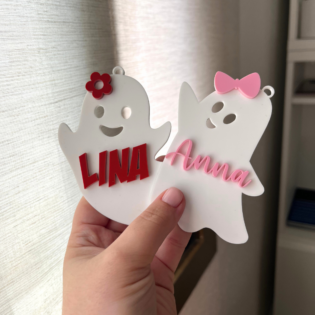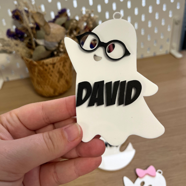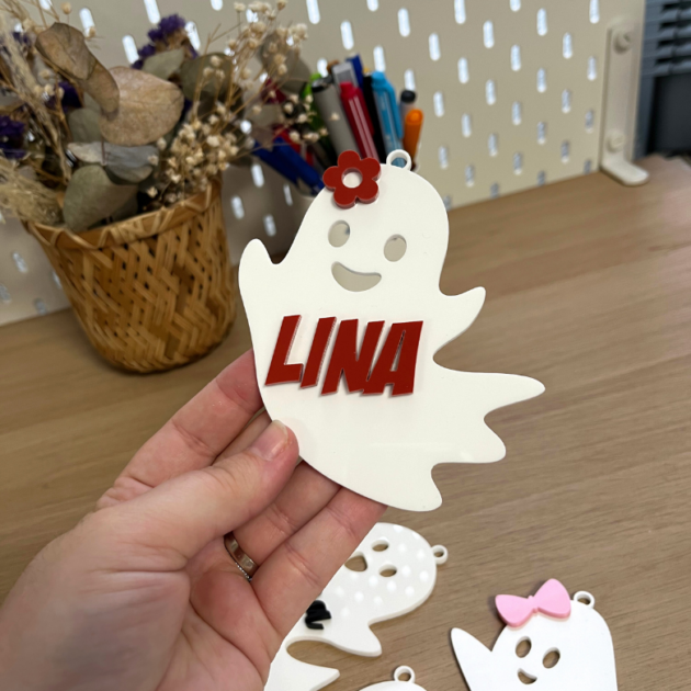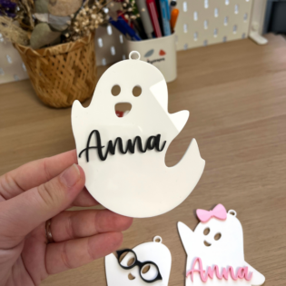 Personnalisez votre fantôme avec le prénom de votre choix. Nous proposons deux styles d’écriture : Anna, en manuscrit élégant, et David, en majuscules façon cartoon, pour répondre à toutes vos préférences. Chaque modèle mesure environ 10×8 cm, une taille idéale pour accrocher ou poser dans votre intérieur.