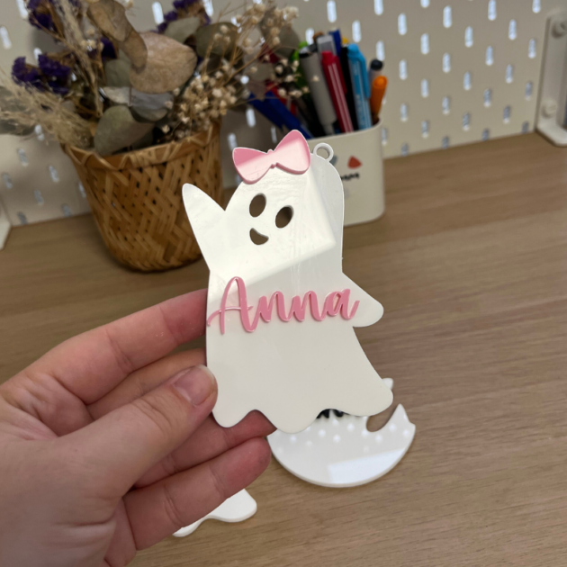 Fantôme blanc personnalisé avec prénom, 4 modèles disponibles. Choisissez votre couleur et style d’écriture. Idéal pour Halloween et autres occasions.